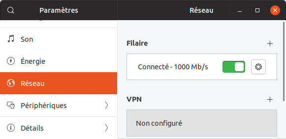 - Ubuntu : Lancer « Paramètres », dans l’élément « Réseau », le débit Filaire doit afficher « 1000 Mb/s »