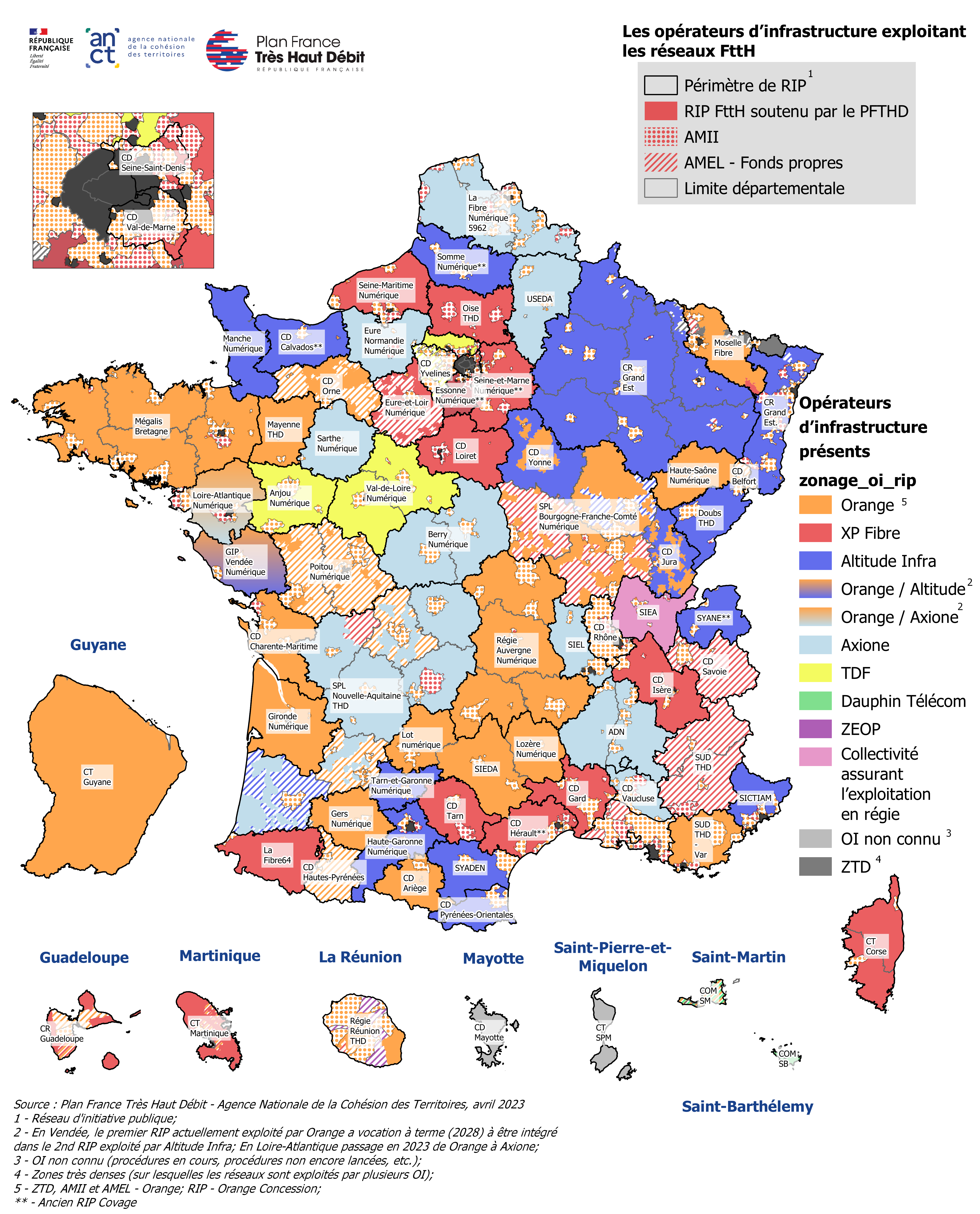 Certains réseaux en fibre optique jusqu'à l'abonné sont financés et appartiennent aux opérateurs privés (ce sont les zones en noir, en pointillé et hachuré sur la carte ci-dessous), d'autres sont financés en partie par des fonds publics et appartiennent aux collectivités territoriales qui les ont fait construire (ce sont les zones en couleurs pleines sur la carte ci-dessous).